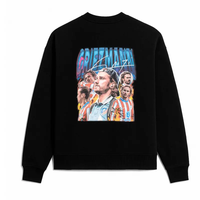 On the front of the sweatshirt, his signature, and on the back, there is a unique visual composition with images of Griezmann at different moments with Atleti: from his most unforgettable celebrations to moments of pure focus. The graphic art, in contrasting tones against the black background, gives it a modern and urban touch that stands out.