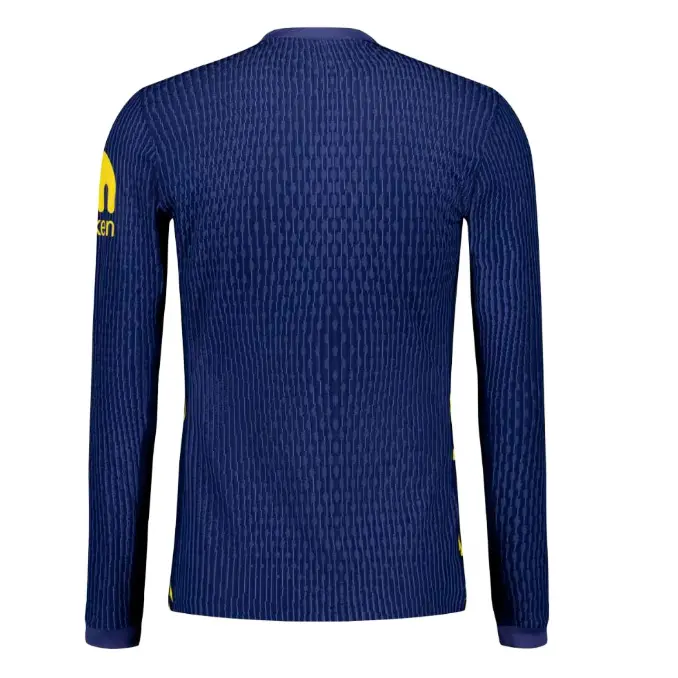 This player edition long-sleeve jersey of Atlético de Madrid’s men’s second kit for the 2025/26 season combines an elegant navy blue with lightning bolt graphics and vibrant yellow details.